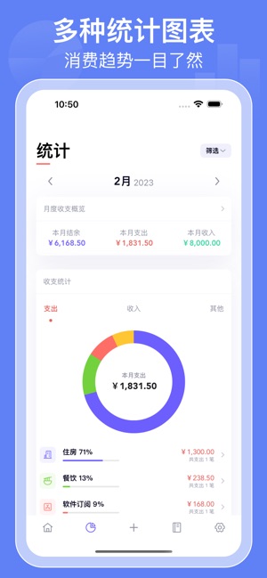 - 图表统计:一目了然的美观图表,帮你快速了解消费情况,让你更加了解自己的消费习惯