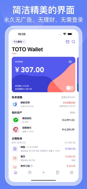 - 资产管理:可添加现金、储蓄卡、信用卡、支付账户、投资理财、债务借出等多种类账户