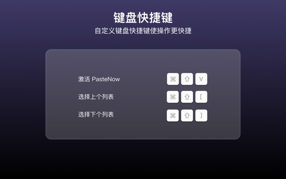 PasteNow 支持全局的键盘操作,无需将双手移开键盘即可完成:呼出剪贴板主界面、搜索选择内容、多选复制粘贴等操作。